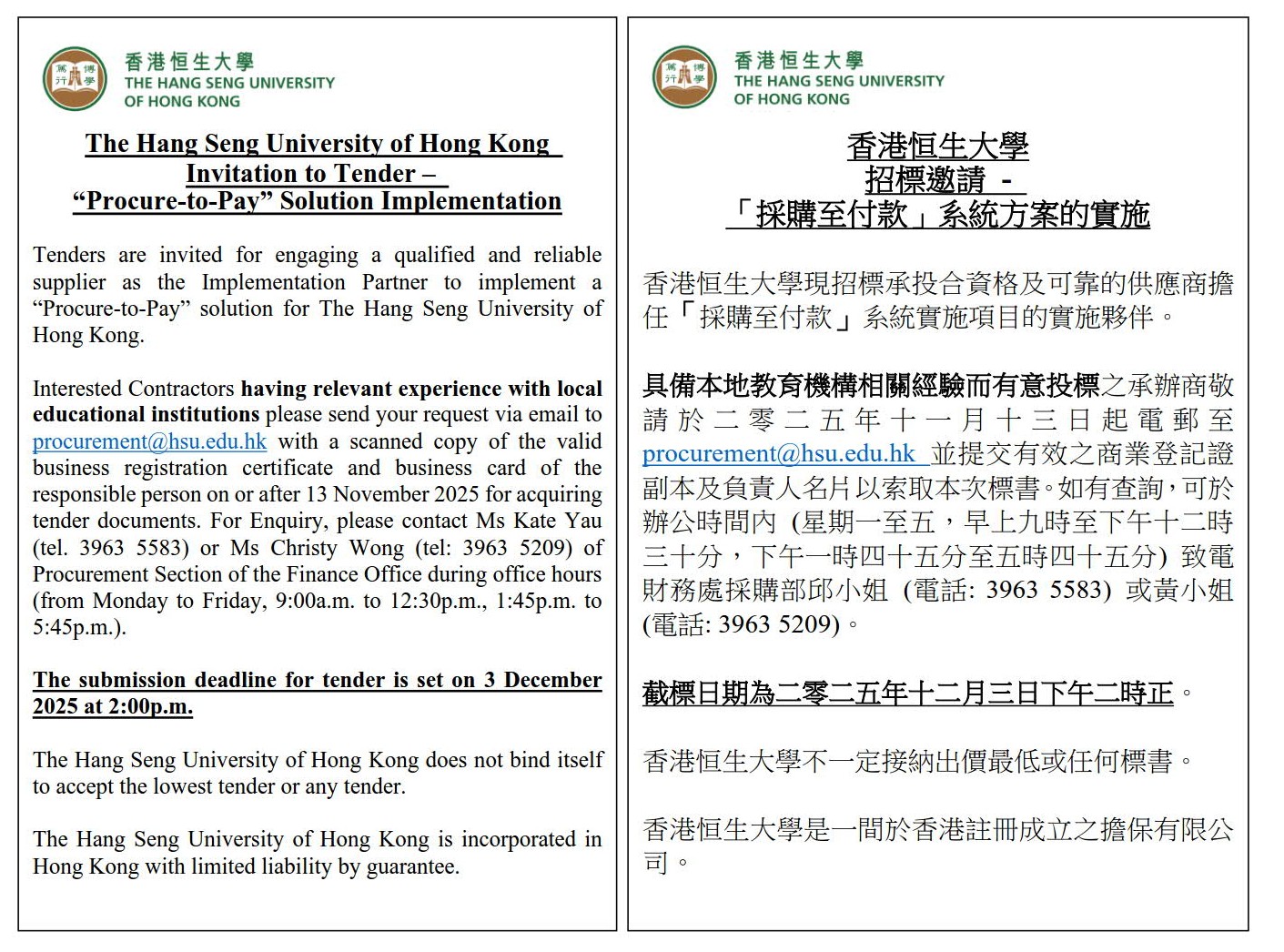 Invitation to Tender – Procure-to-Pay Solution Implementation Project for The Hang Seng University of Hong Kong November 13, 2025