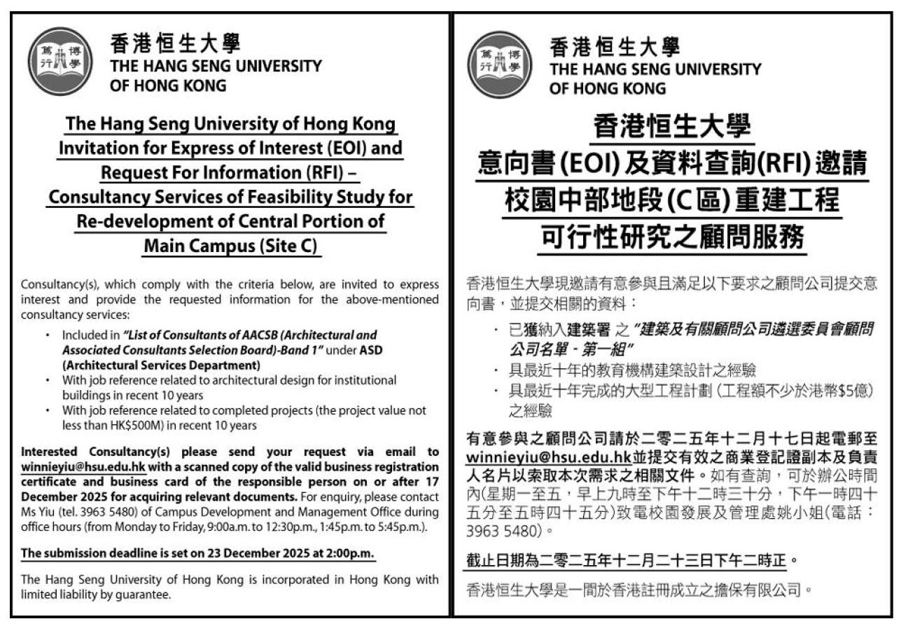 Invitation for Express of Interest (EOI) and Request For Information (RFI) – Consultancy Services of Feasibility Study for Re-development of Central Portion of Main Campus (Site C) December 17, 2025