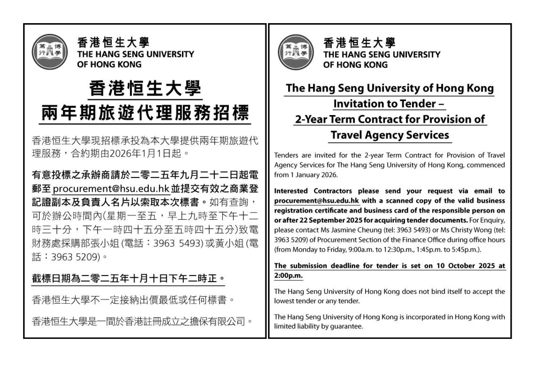 Invitation to Tender – 2-Year Term Contract for Provision of Travel Agency Services for The Hang Seng University of Hong Kong